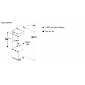 Schrank mit Maßen in mm: Höhe 2200, Breite 560, Tiefe 560. Darstellung mit Pfeilen für Abmessungen und Steckdose (B).